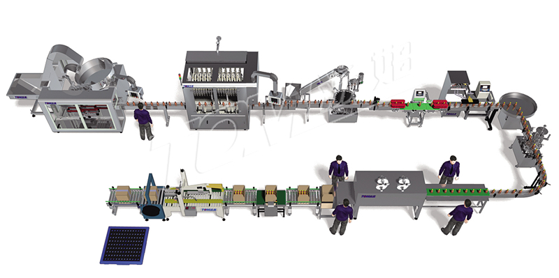·100-1000ml的圓瓶包裝線:本流水線由自動(dòng)理瓶、活塞式灌裝、自動(dòng)上蓋機(jī)、旋蓋機(jī)、單瓶檢重、緩沖轉(zhuǎn)盤、自動(dòng)貼標(biāo)、人工套膜、電加熱收縮、人工裝箱、自動(dòng)箱檢重(不合格的停機(jī)報(bào)警)、自動(dòng)封箱打包、人工碼垛組成。
