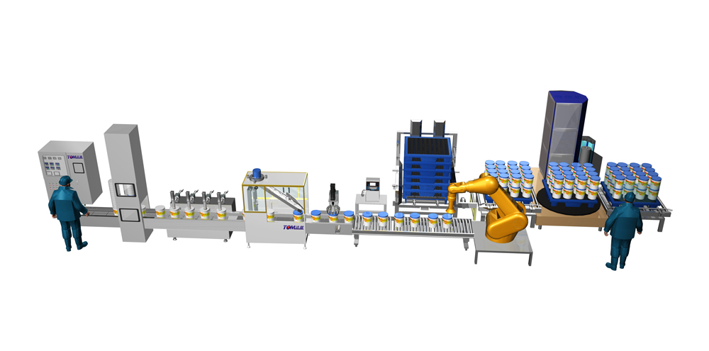 此條生產線設備配置:上桶機、全自動稱重式灌裝機、全自動封蓋機、噴碼機、裝箱機、封箱機、機器人碼垛機/機械式碼垛機、自動捆扎與纏繞機。